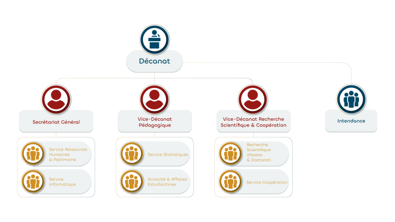 L’organigramme de la Faculté d’Économie et de Gestion – Settat présente la structure organisationnelle de notre institution, mettant en lumière les responsabilités et rôles de chaque membre. Cette organisation témoigne de notre engagement à assurer une gouvernance efficiente, une gestion optimale des ressources et une excellence académique au service de nos apprenants et partenaires.