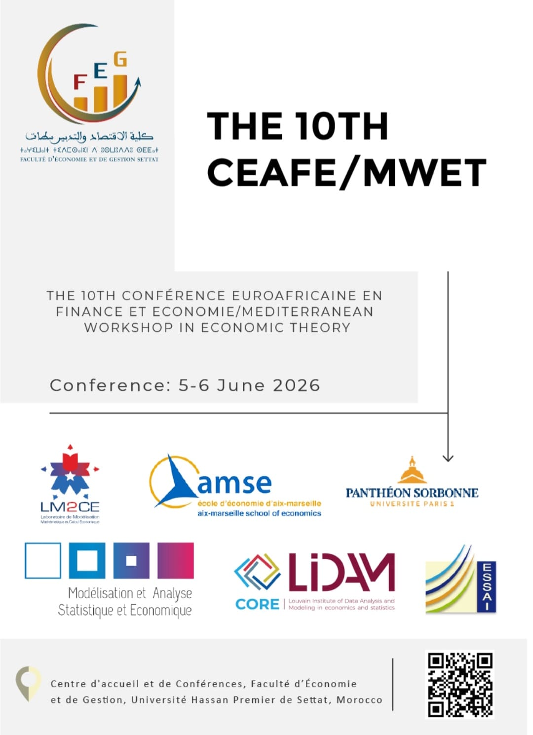 The 10-th CEAFE/MWET (Conférence Euro-Africaine en Finance et Economie/ Mediterranean Workshop in Economic Theory) will be taking place in Faculté d’Économie et de Gestion Settat on 5-6 of June 2026.